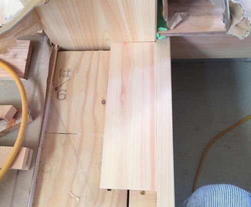 さて、やっと檜の造作材を まずは大黒柱へ6分厚の無目敷居を 思った通り矩に切っても合わないそこで大黒柱への突き付けが合うように付け框にパッキンを飼う ふむふむ どうやら大黒柱から2寸5分ほど離れたところに2ミリパッキンを飼うといいらしいこのパッキ…