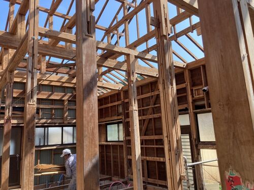 さて、今週水曜からI君元請け物件のフルリノベ物件に 文字通りのスケルトンからのスタートただ久々の外仕事が屋根だとしんどいね 暑さでひっくり返そうになったそれに5寸だと思っていた勾配は、なぜか5寸2分5厘と訳のわからない勾配だったりで(苦笑) 来週も…